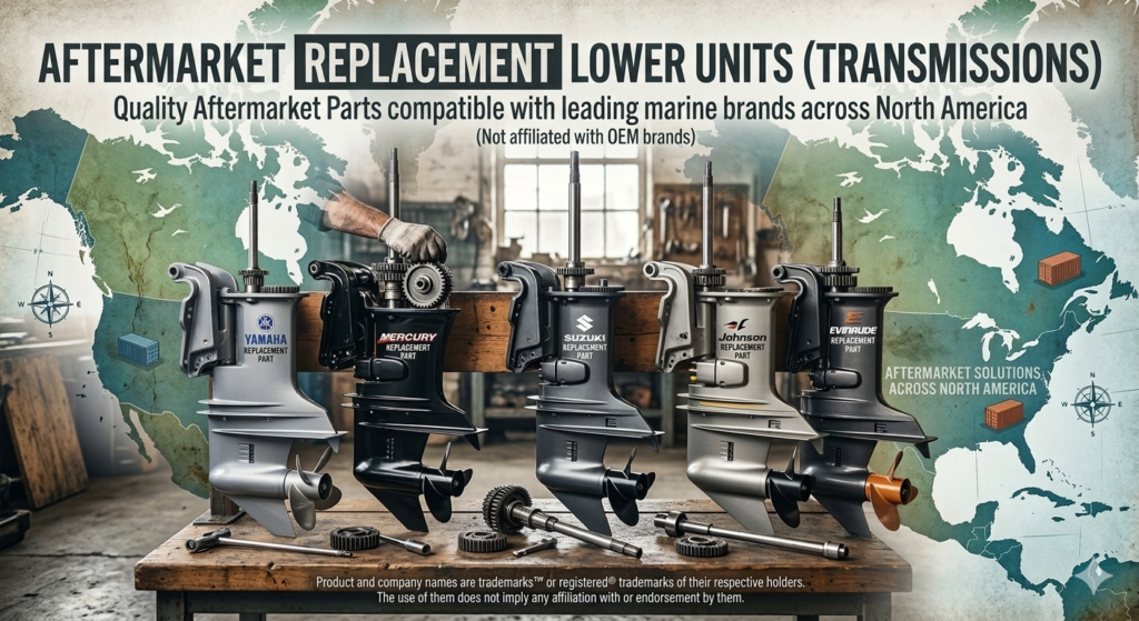 - Aftermarket lower units: new, non‑OEM gearcases made overseas to OEM‑style dimensions, complete with all internals and often backed by up to a 3‑year “fault‑free” factory warranty.